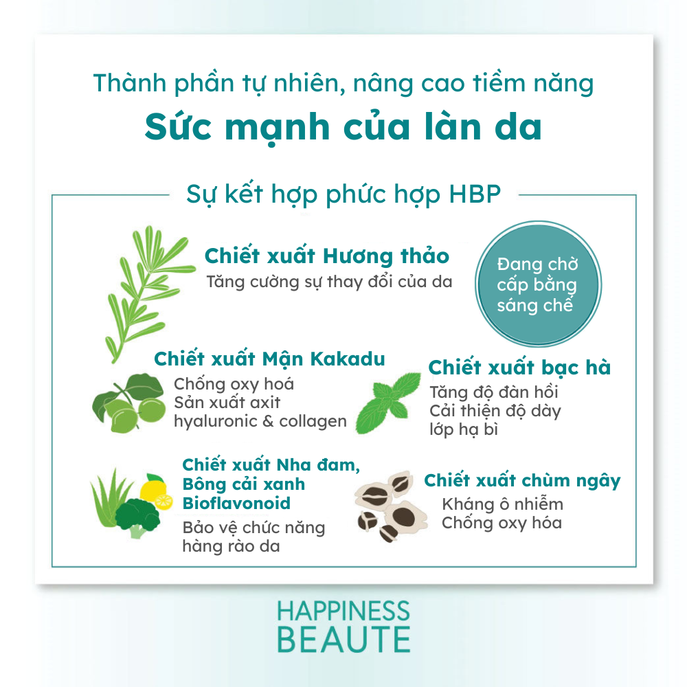 - Moringa Seed Extract, Aloe Vera Leaf Extract, Broccoli Extract, Bioflavonoids: dưỡng ẩm, chống oxy hóa, bảo vệ da khỏi các tác nhân môi trường.