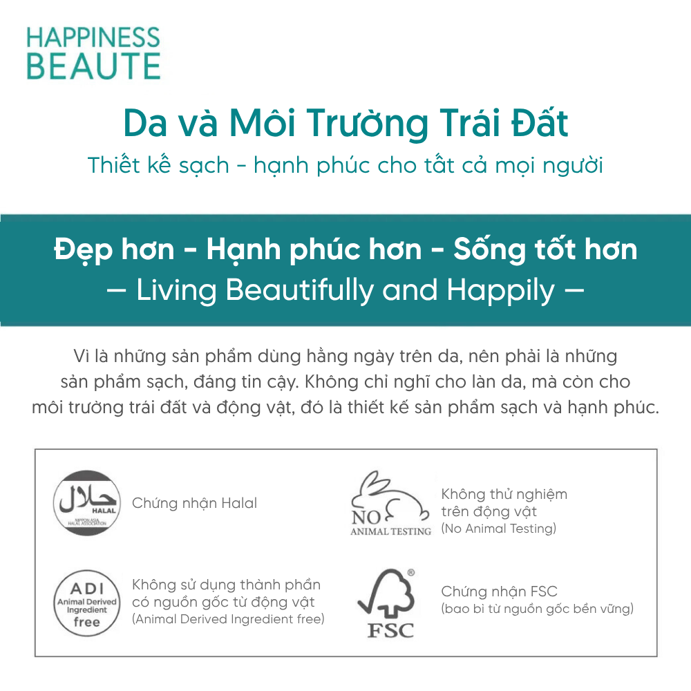 - Thành phần hoàn toàn thuần chay (vegan), không sử dụng thành phần có nguồn gốc động vật, không thử nghiệm trên động vật.